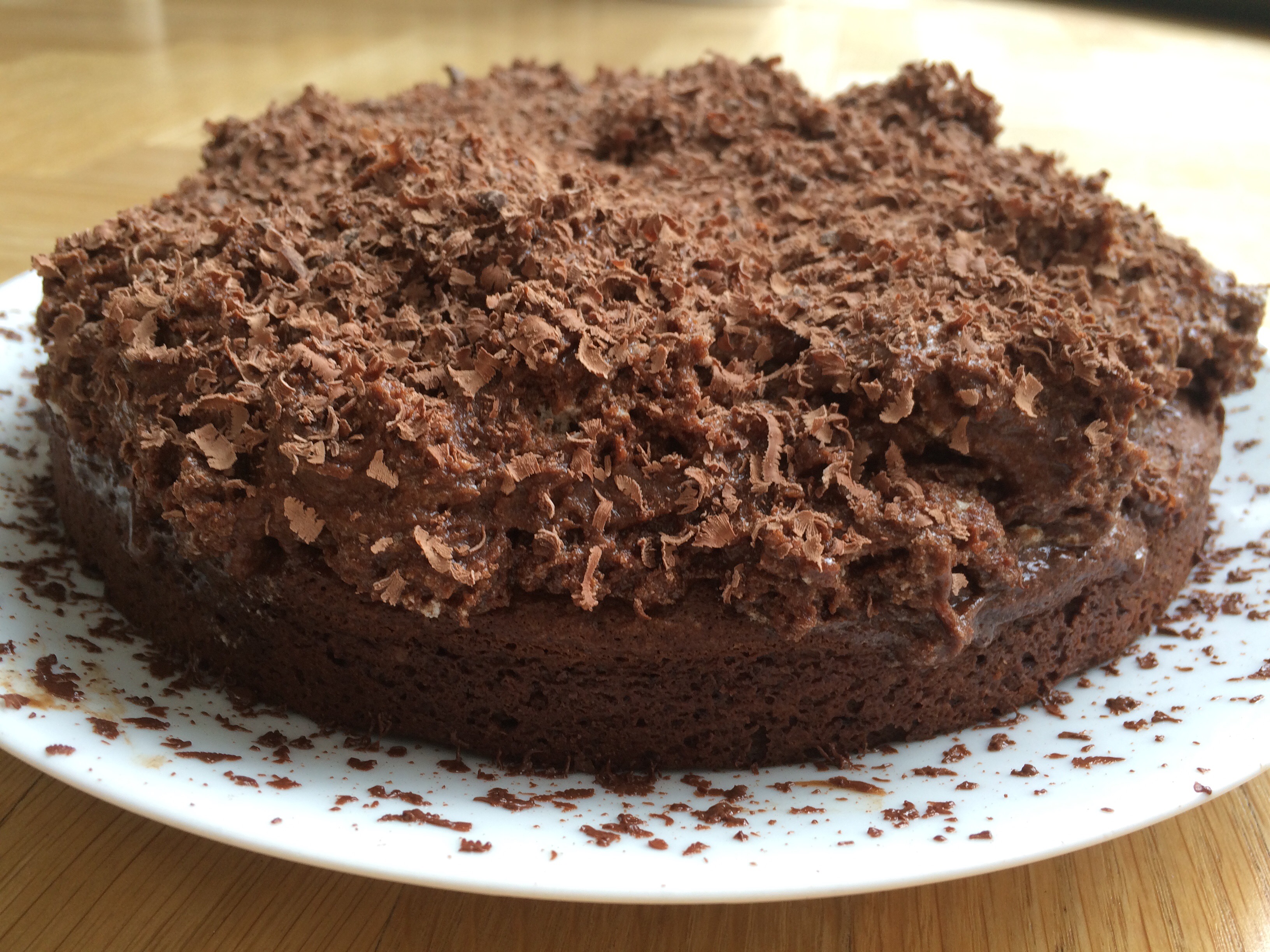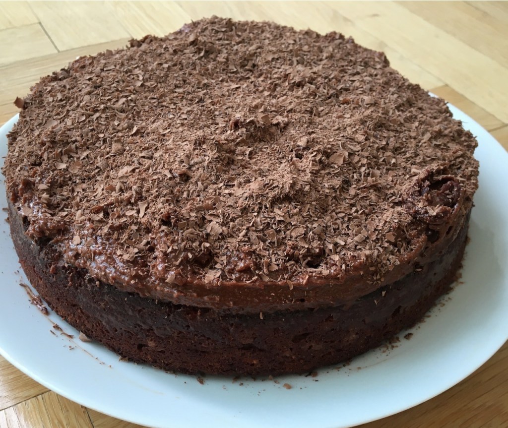 Sortir le gâteau du four et laisser refroidir dans son assiette de présentation. Napper enfin le gâteau de sa mousse au chocolat.