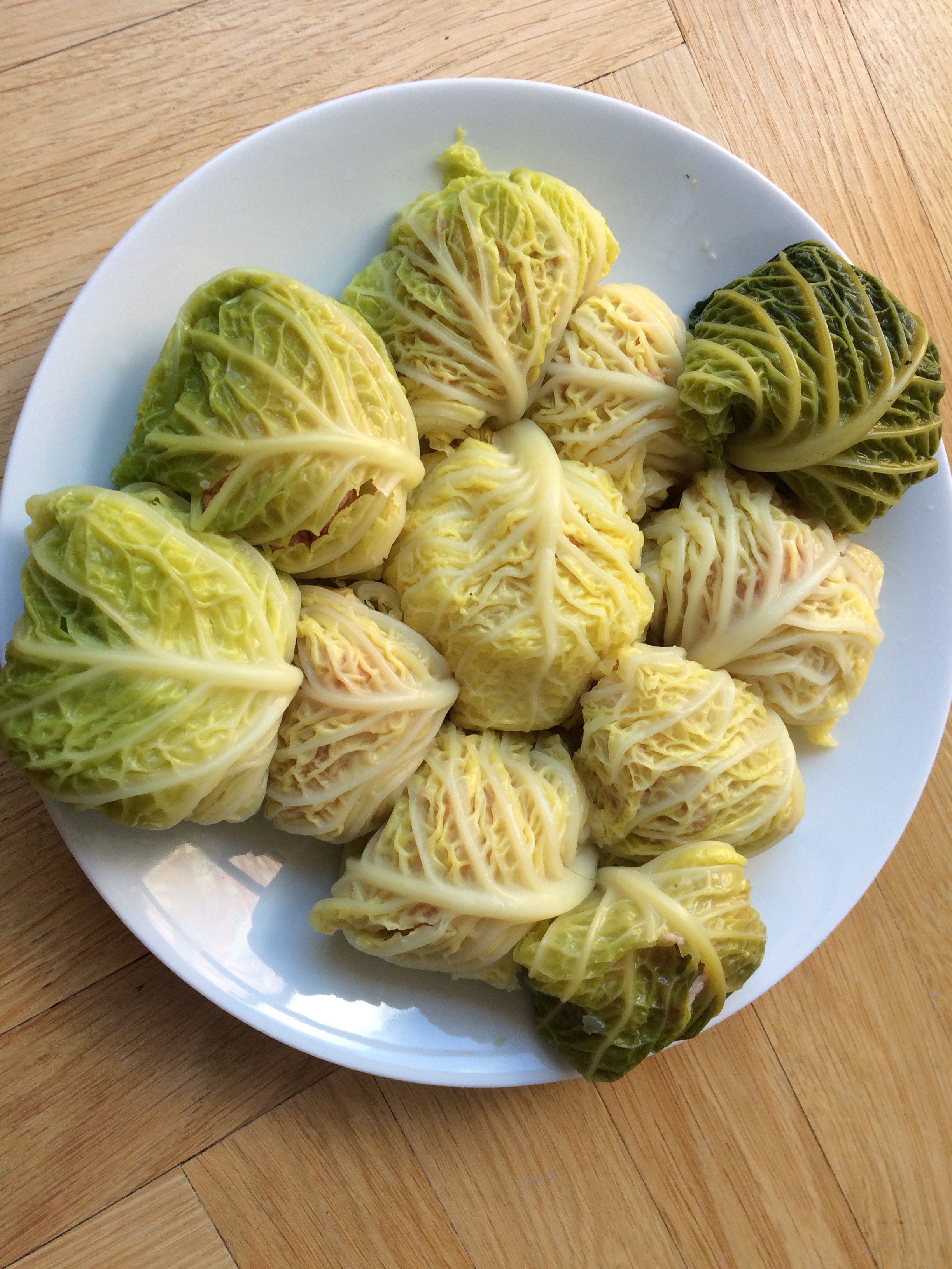 Pendant ce temps, préparer les petits choux. Il suffit de prendre une bonne cuillère à soupe de farce, de la mettre au bord d’une feuille de choux et de l’emballer. Il faut être délicat dans la manipulation. Réserver les petits choux dans une assiette.