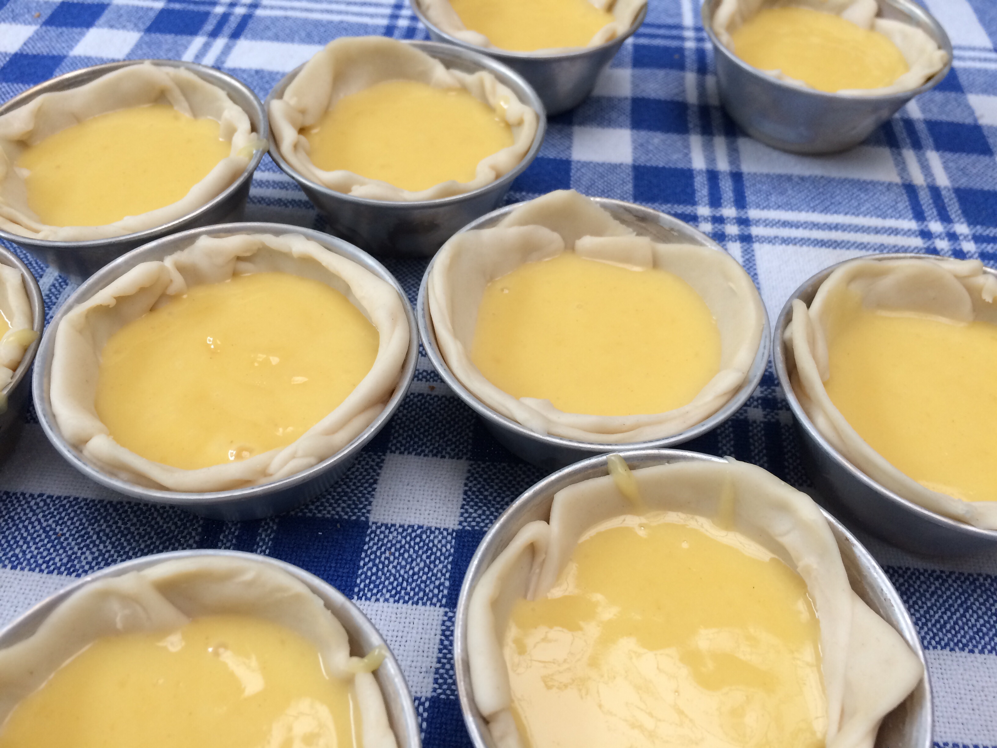 Ayant déjà fait des pasteis à base de lait… j’ai tenté cette fois la recette à base de crème fraîche. Le résultat est topissime. L’aspect est légèrement différent mais la crème en est plus onctueuse.