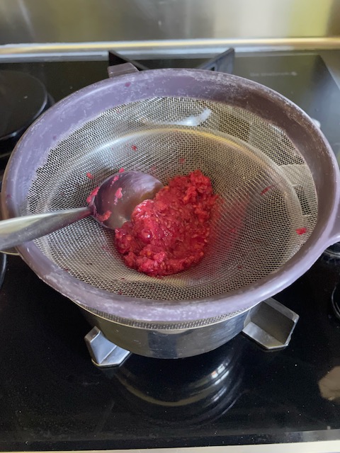 Verse le tout dans un écumoire et laisse le jus couler sans trop presser les fruits.