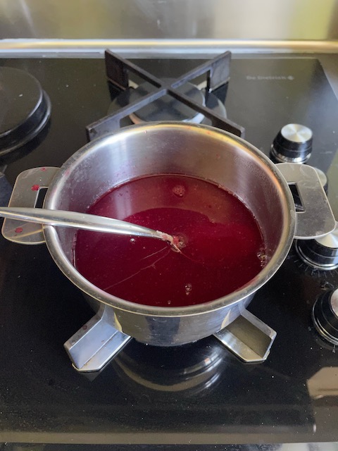 Maintenant tu peux porter à ébullition en mélangeant régulièrement et en veillant à ce que le sucre fonde dans le jus. Remue pendant 5 voir 10 minutes max. et vérifie que le jus ne caramélise pas. Aussi, régule bien le feu.