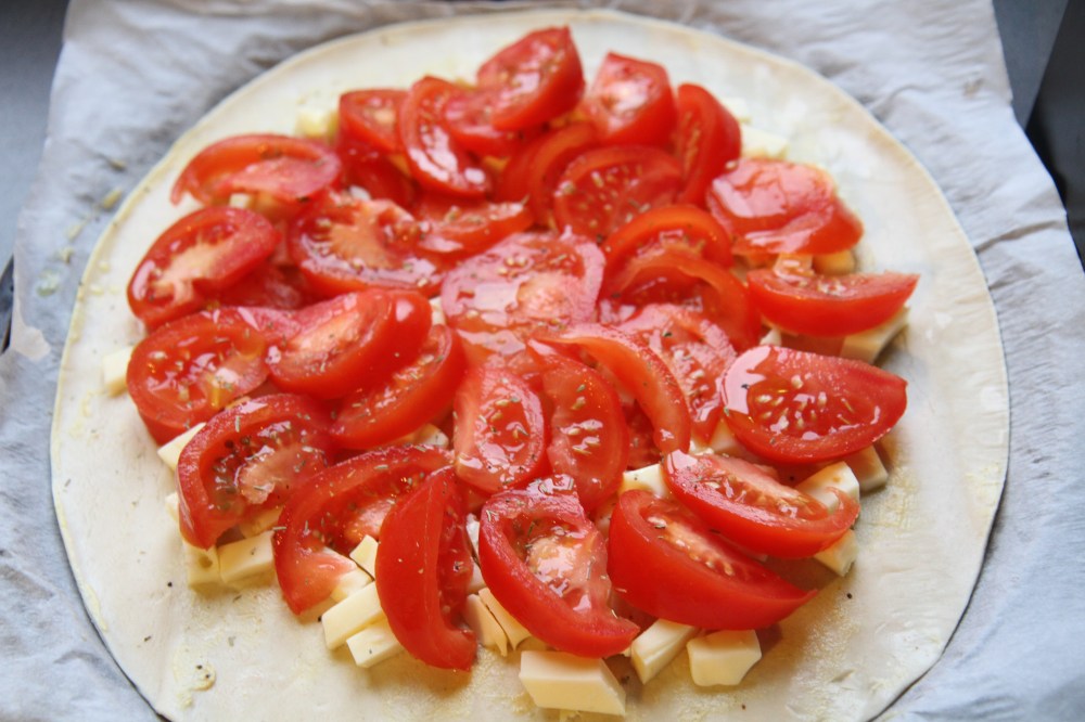Découper les tomates en tranches en ayant retiré le pédoncule et la partie fibreuse centrale. Répartir les tranches en formant une rosace. Verser un filet d’huile d’olive en un geste circulaire. Saupoudrer d’herbes de Provence, de sel et de poivre. Rabattre les bords de la pâte feuilletée et lancer au four.