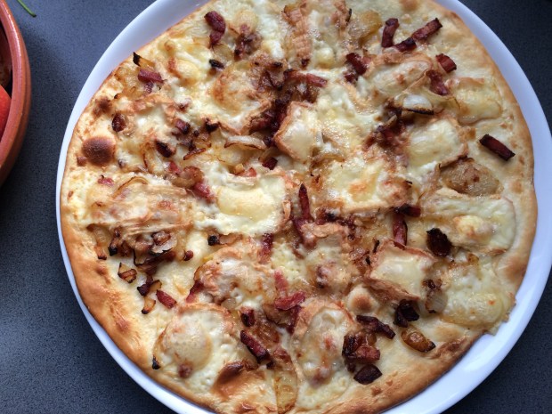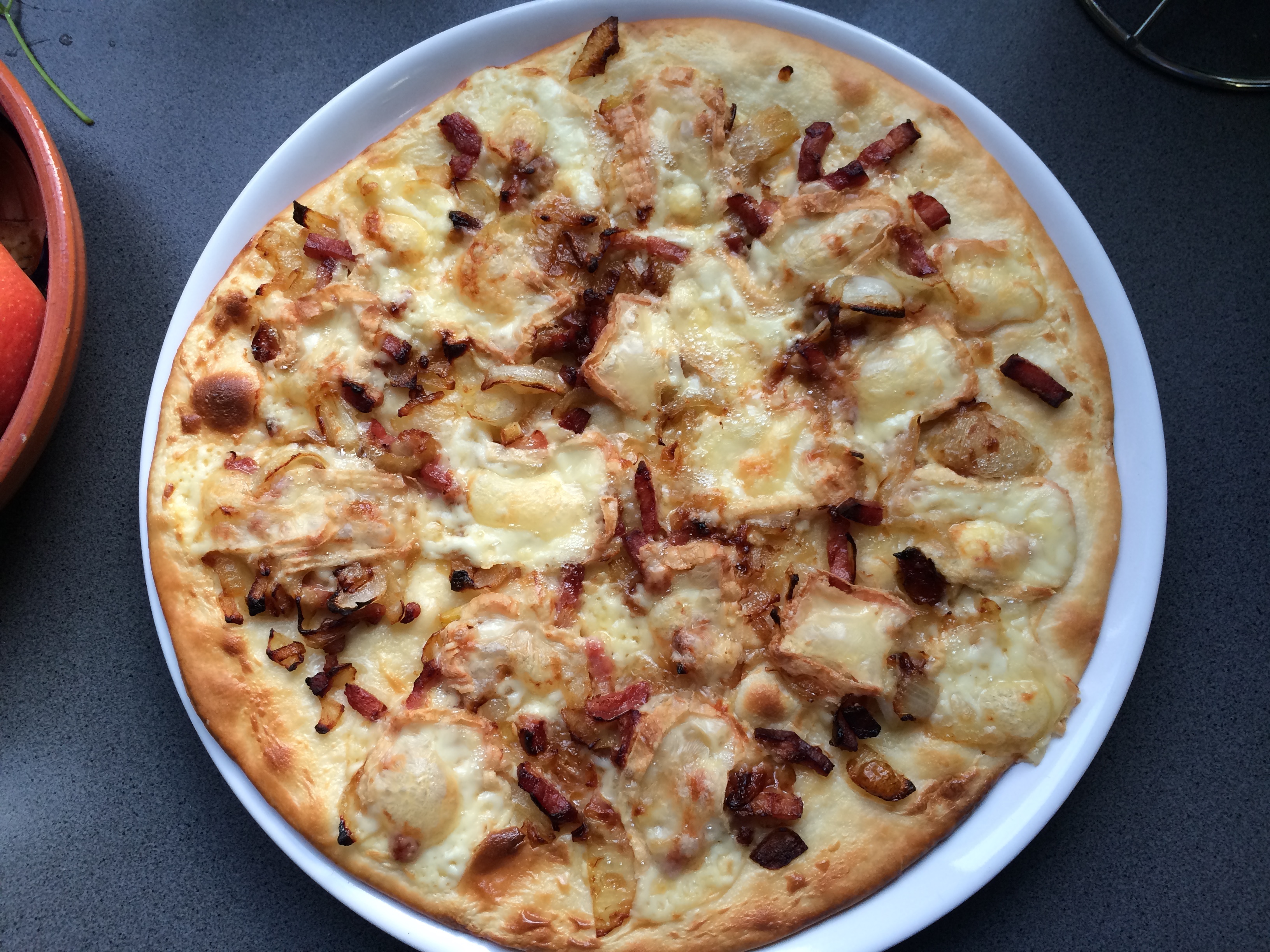 La flammekueche est une très bonne alternative à la pizza. Le Maroilles, célèbre fromage nordiste, relève parfaitement le tout. Rapide à faire le soir avec une pâte à pain industrielle, vous pouvez préparer votre propre pâte. Je vous laisse découvrir les explications pour la pâte à pain en cliquant sur ce lien. Une consigne toutefois ! La pâte de la flammekueche se doit d’être très fine : l’épaisseur de la croûte de pain : 2-3 mm suffisent.