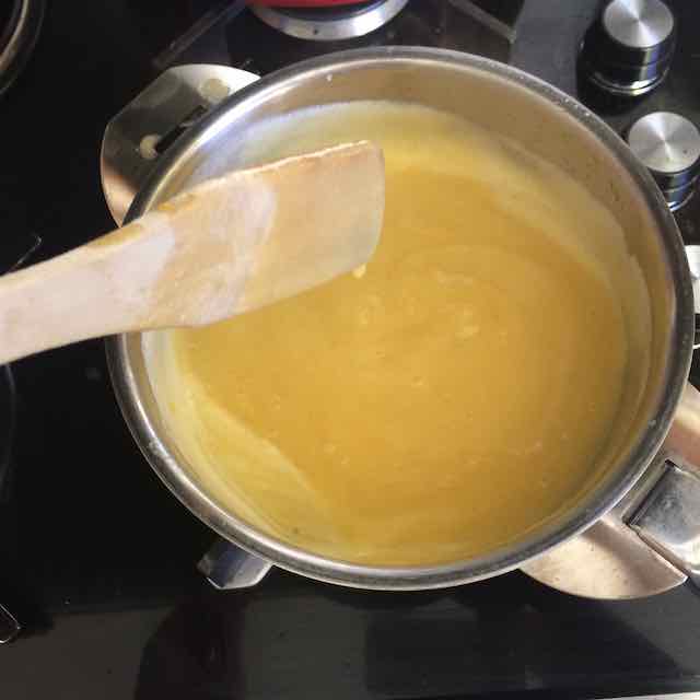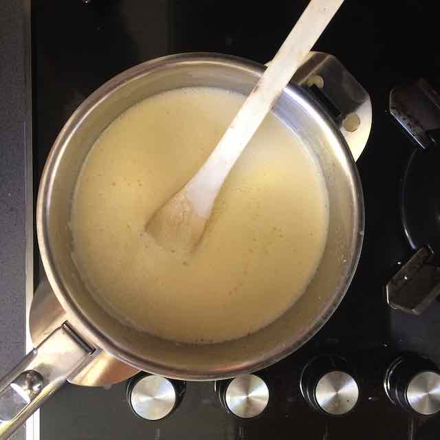 - Versez le mélange dans la casserole et chauffez à nouveau. Portez à ébullition et baissez le feu pour ne pas brûler le fond.