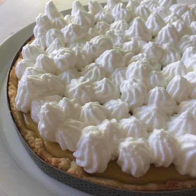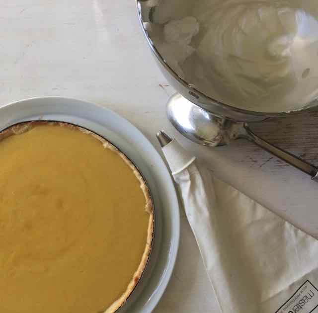 Monter la meringue sur la tarte : plier vers l’extérieur les bords de la poche à douilles. Remplir la poche de meringue en allant bien au fond de la poche. Remonter les bords pour finir de remplir et plier l’extrémité. Saisir la poche à 2 mains. L’une presse par le haut et l’autre dirige le geste. Dresser des petits points de meringue en commençant par le centre de la tarte. C’est en appuyant sur la poche que la forme gonfle. Pas besoin de tourner avec la poche. Bien serrer chaque point pour cacher la crème en-dessous.