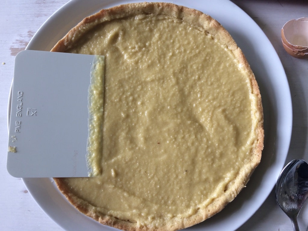 - Préparation alternative d’une crème d’amandes : dans un saladier, mélangez les oeufs et le sucre jusqu’à ce que le mélange s’éclaircisse. Ajoutez les amandes en poudre et le beurre en pommade. Mélangez énergiquement pour ne pas avoir de grumeaux de beurre. Versez dans le fond de tarte et répartissez la crème sur toute la surface. Vous pouvez utiliser une raclette à pâtisserie plate, très pratique.