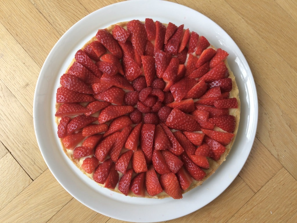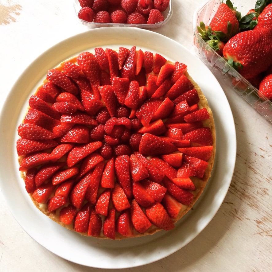 Impossible de résister aux étals de fraises. C’est la saison. Régalons-nous ! La tarte aux fraises est un grand classique de la pâtisserie française, à l’image de notre patrimoine culinaire. La tarte au fruits mets en avant la maîtrise de techniques comme ici, savoir faire un fond de tarte parfaitement ajusté avec un cercle et de l’autre la richesse de notre territoire. Nous avons la chance en France de disposer d’une grande diversité de fruits et légumes frais récoltés sur place par nos agriculteurs et maraîchers. Alors profitons en avril et mai pour faire cette tarte délicieuse et fraîche. Je l’ai twistée en ajoutant quelques framboises au centre.