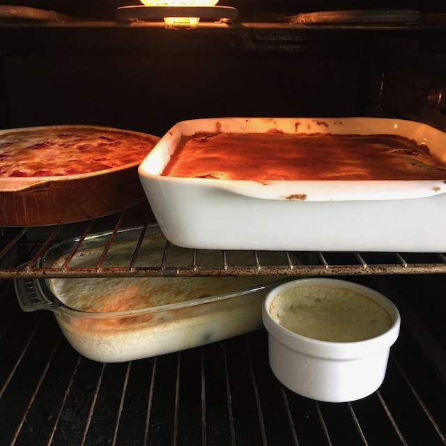 NB : Je vous conseille de diviser la recette en 2 car comme vous pouvez le voir en photo, j’ai fait 3 petits plats à gratin. Pour utiliser toute la crème à clafoutis, j’ai dû sortir des fruits du congélateur : framboises et cerises !