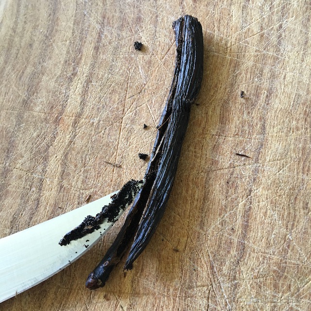 Dans une casserole, versez le lait. Ajoutez la gousse de vanille taillée sur la longueur pour que les grains puissent parfumer le lait. Portez à ébullition puis versez au mélange du saladier. Mélangez à nouveau.