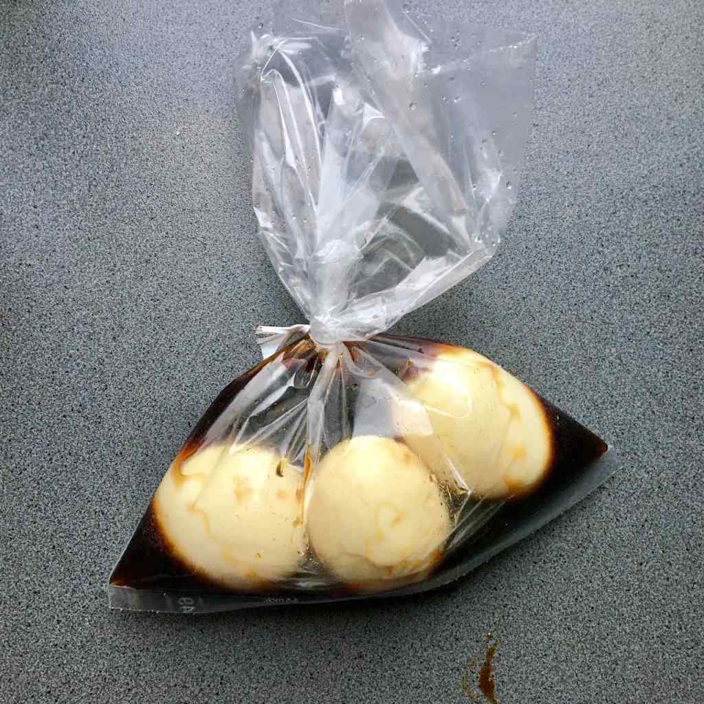 - Préparer vos oeufs mollets : déposez vos oeufs dans une casserole d’eau bouillante et laissez cuire 6 minutes. Une fois refroidis et écalés, mettez les œufs mollets dans un sac de congélation et versez la sauce. Fermez avec un lien et laissez reposer 1 voire 2 jours dans le frigo.