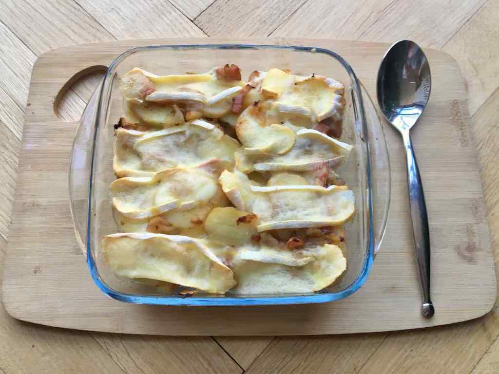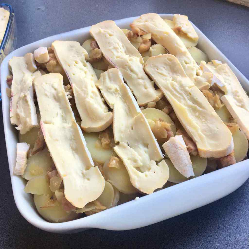 Il ne reste plus qu’à mettre en place les ingrédients dans le plat : alternez donc 2 couches de pommes de terre / oignons-lardons / fromage.