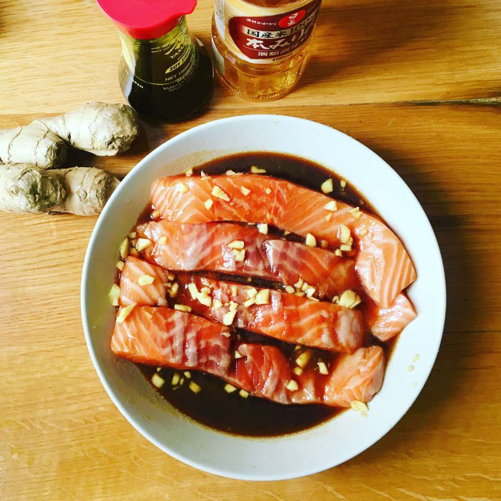 Etape 2 – Dans un plat creux déposez le gingembre râpé, la sauce refroidie et les pavés de saumon. Laissez mariner 30 mn.