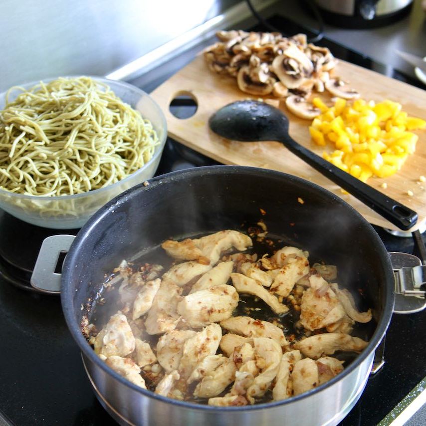 Dans le wok ou la sauteuse, faites chauffer l’huile et versez le gingembre. Dorez quelques secondes et versez les morceaux de poulet. Laissez saisir 2-3 minutes. Ajoutez le poivron et les champignons, mélangez. Ajoutez les nouilles et mélangez. Continuez la cuisson. Ajouter le surplus de sauce soja du poulet, la ciboule, le sel et le poivre. Mélangez. Parsemez de sésame et c’est prêt.