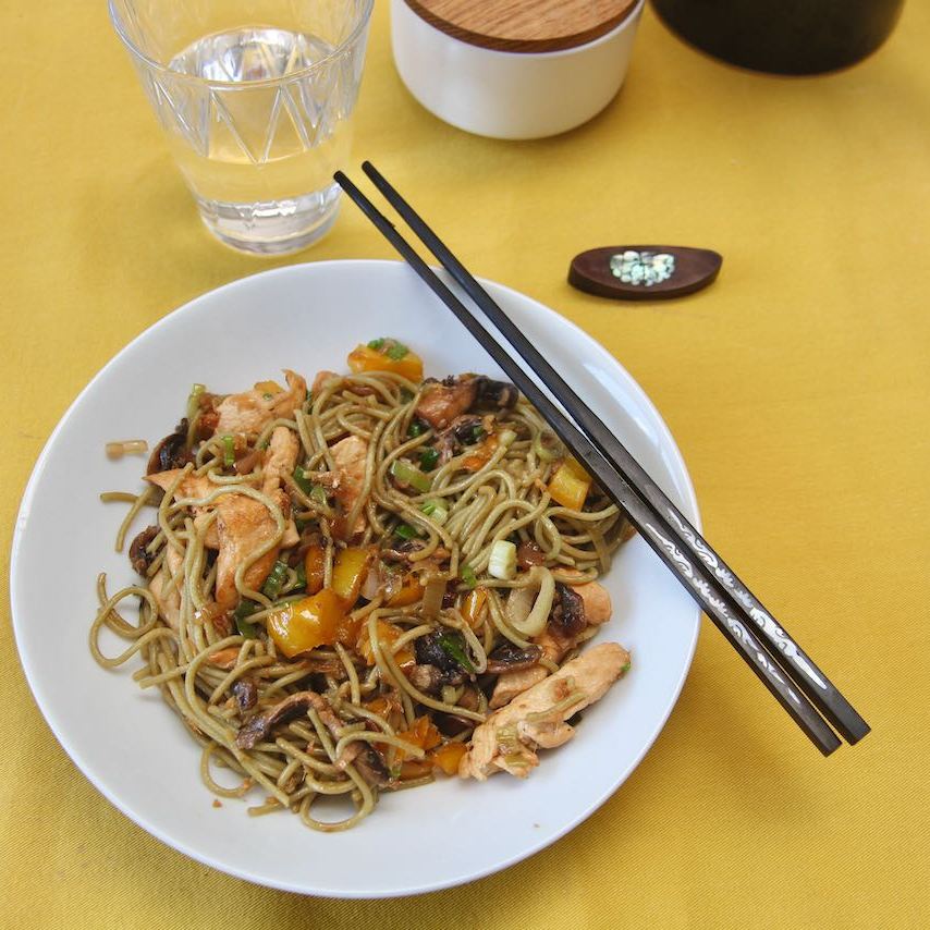 Je vous partage un plat chinois peu épicé, très parfumé et rapide à faire. A base de nouilles sautées et de poulet, ce mian contient du gingembre frais, du poivron et de la ciboule que l’on la trouve facilement au printemps sur les étales.