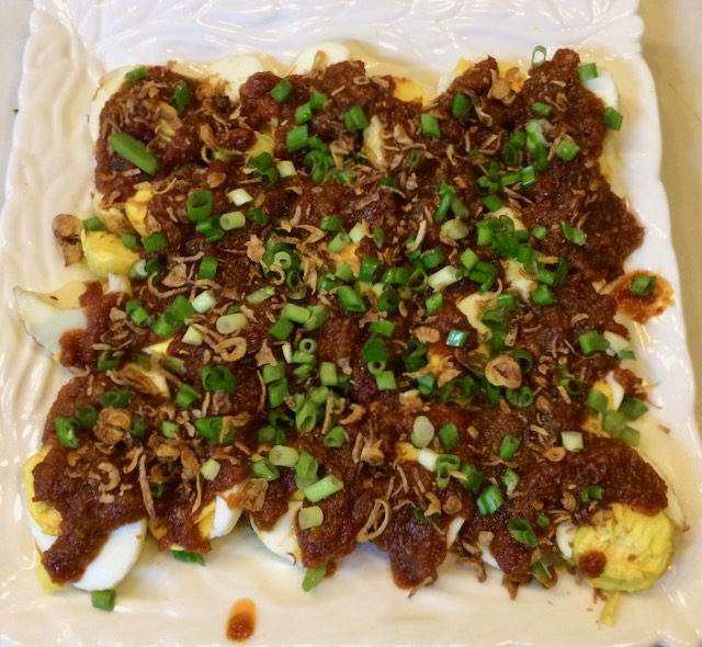 Je vous livre cette fois une entrée à base d’œufs durs, les œufs sambal. Ils avaient été préparés pour l’entrée. Si je dois comparer, je parlerais des œufs mimosa mais point de mayonnaise ici : place aux épices, aux échalotes et aux oignons.
