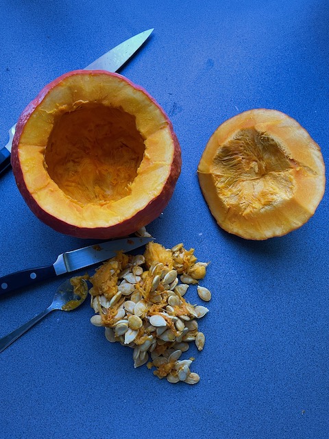 Préparation du potiron farci au chaource et aux fines herbes – latabledejacinta.com