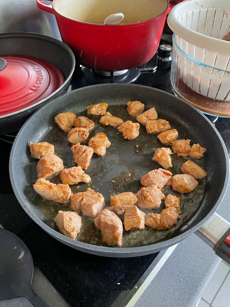 Sortez une poêle à fond plat et bien large. Versez un filet d’huile d’olive et chauffez votre cocotte. Déposez vos morceaux de viande bien égouttés. Il s’agit ici de saisir la viande. Il faut éviter de la laisser se dégorger. Ajoutez un bon filet d’huile d’olive pour continuer la cuisson de la viande.