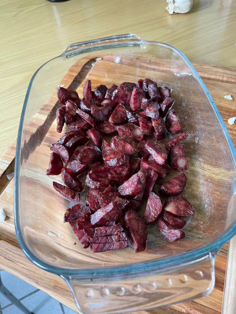 Le chouriço ne fait pas officiellement partie de la recette mais il ajoute un touche fumée à la recette. J’enlève au préalable la peau du saucisson et découpe le chouriço en tranches. J’étale le tout dans un plat allant au four et le cuit légèrement. Cela permet d’évacuer l’excès de gras. Dans le plat, il aura bien plus de goût s’il est passé au four avant.