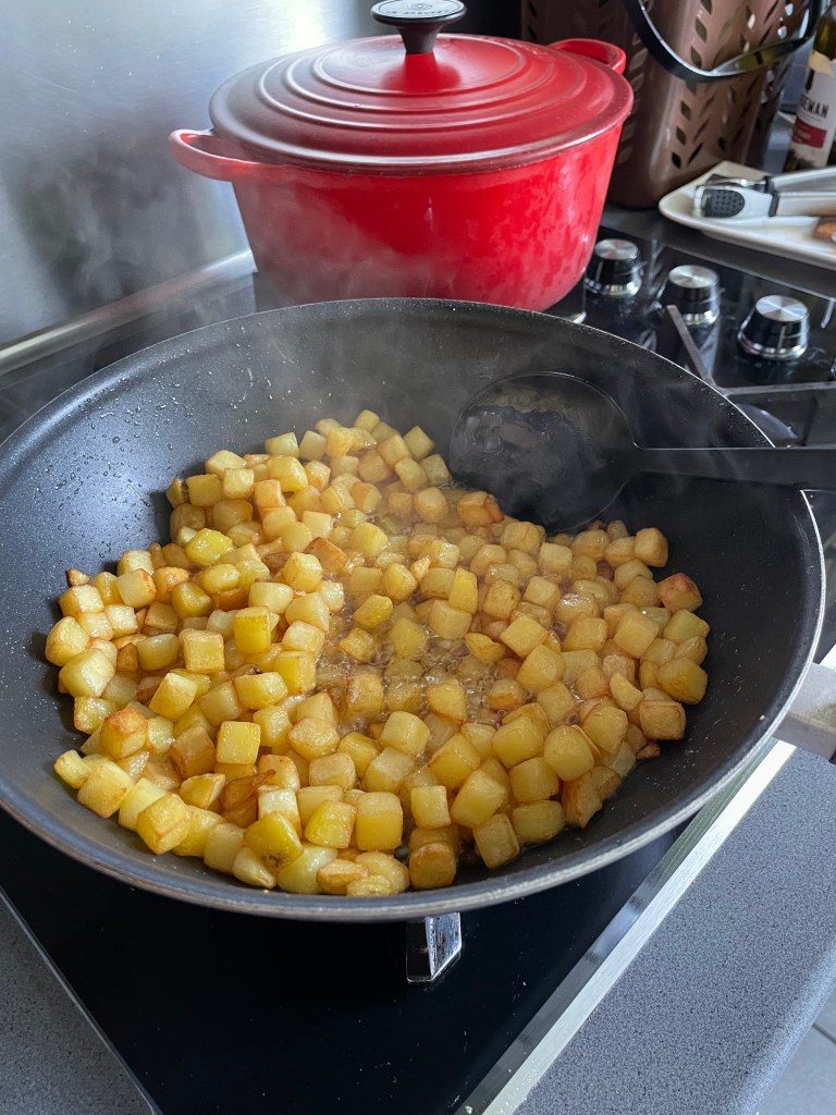 Ce plat se sert avec des pommes de terre frites en cubes ou bien des pommes de terre cuites à l’eau. Ne remplacez pas par des frites. Cela ne se mélangerait pas bien avec les cubes de viande et les coques.
