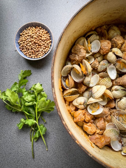 Cette recette originale est une de ces rares recettes qui réunissent terre et mer. Ce n’est pas commun mais laissez-vous charmer par ce plat qui équilibre bien les deux territoirs. Le plat est plus parfumé qu’épicé. Il tient son identité à l’utilisation de la coriandre fraîche et en grain. Quant au chouriço, il ajoute une note fumée au tout.
