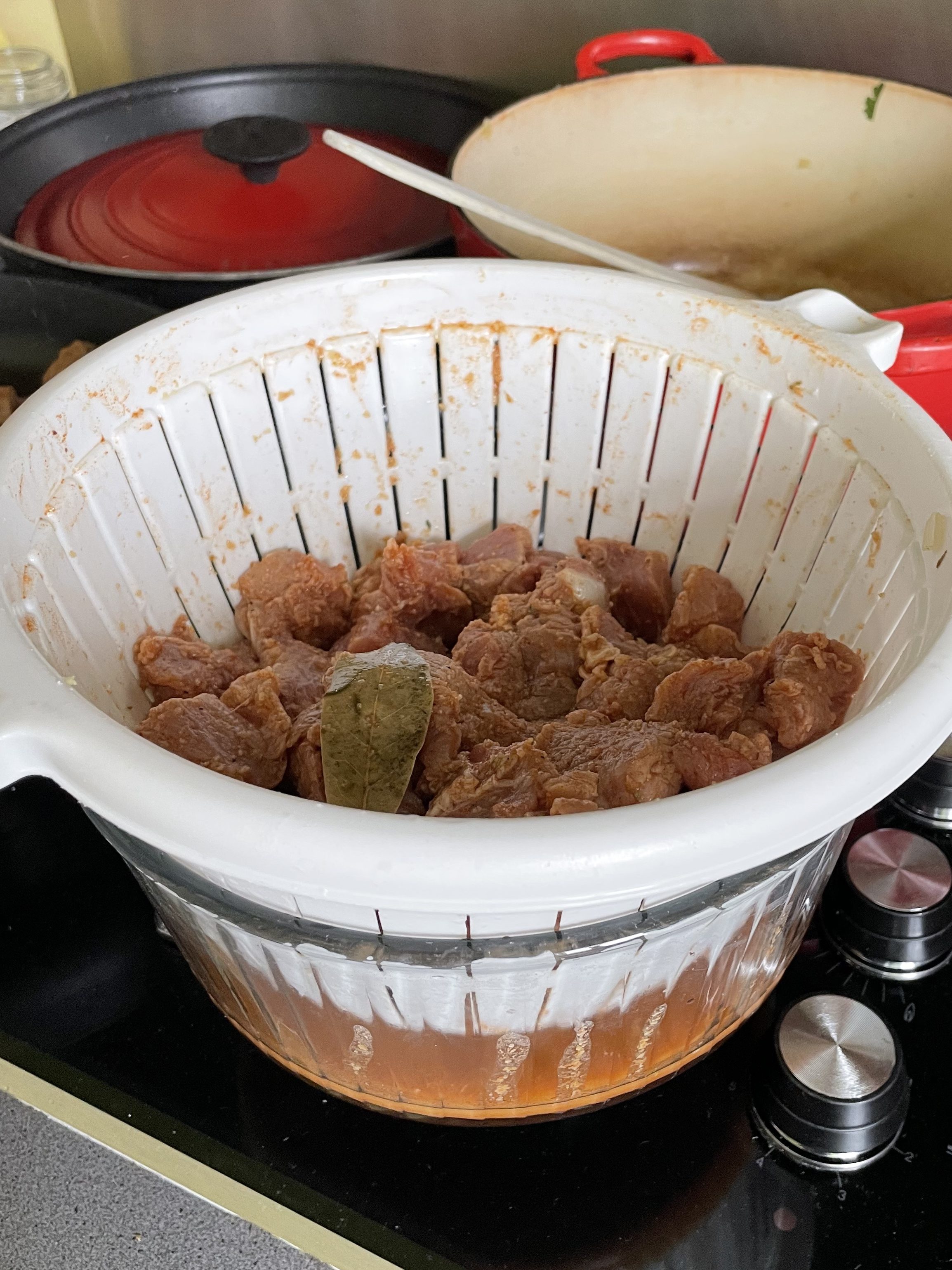Découpez le filet de porc en cubes et déposez-les dans un saladier. Versez le paprika, l’ail émincé, le laurier et la coriandre en grain moulue au pilon. Arrosez de vin blanc et réservez votre saladier 1 à 2 h au frigo. Vous pouvez même préparer la veille pour plus de goût.