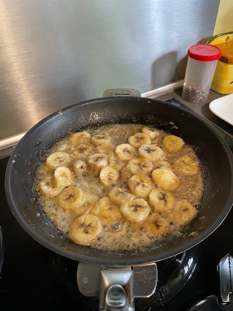 Dans une poêle, faites fondre une belle noisette de beurre et déposez les bananes découpées en morceaux. Écrasez et ajoutez le vieux rhum. Dès que l’alcool du rhum s’est évaporé, vous pouvez ajouter les bananes poêlées dans votre pâtes à gâteau.