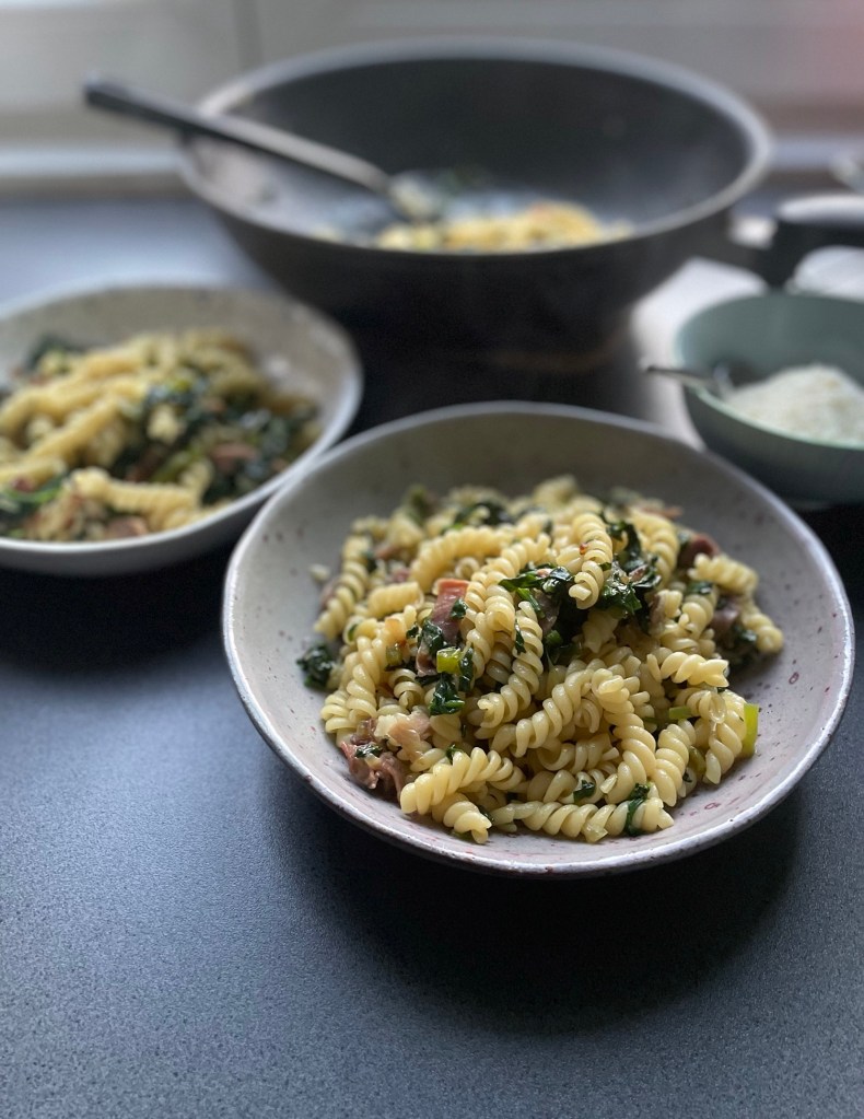 Verse les pâtes dans la poêle. Reprends le feu. Mélange bien pour faire un tout homogène et assécher les pâtes. N’hésite pas à ajouter un filet d’huile d’olive.
