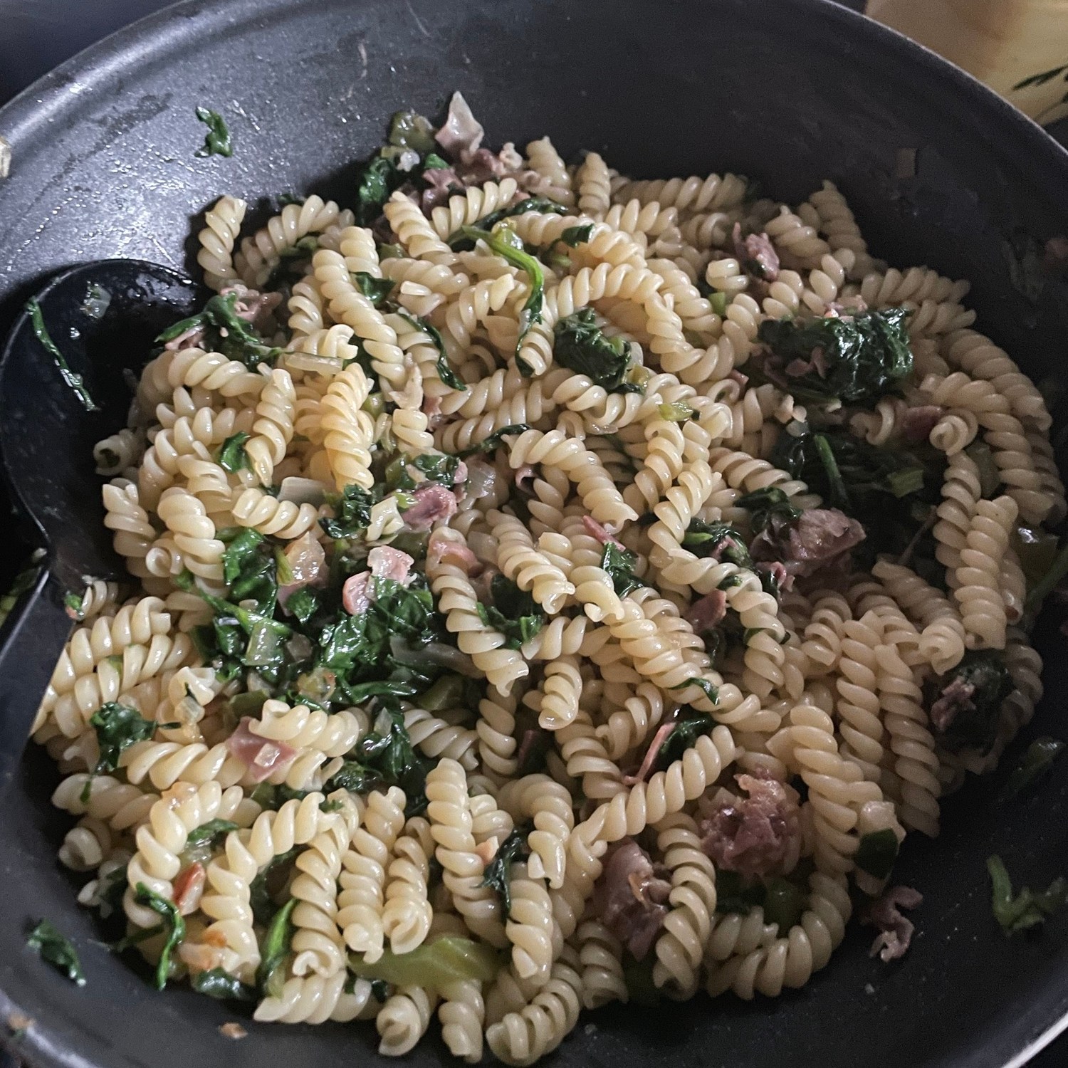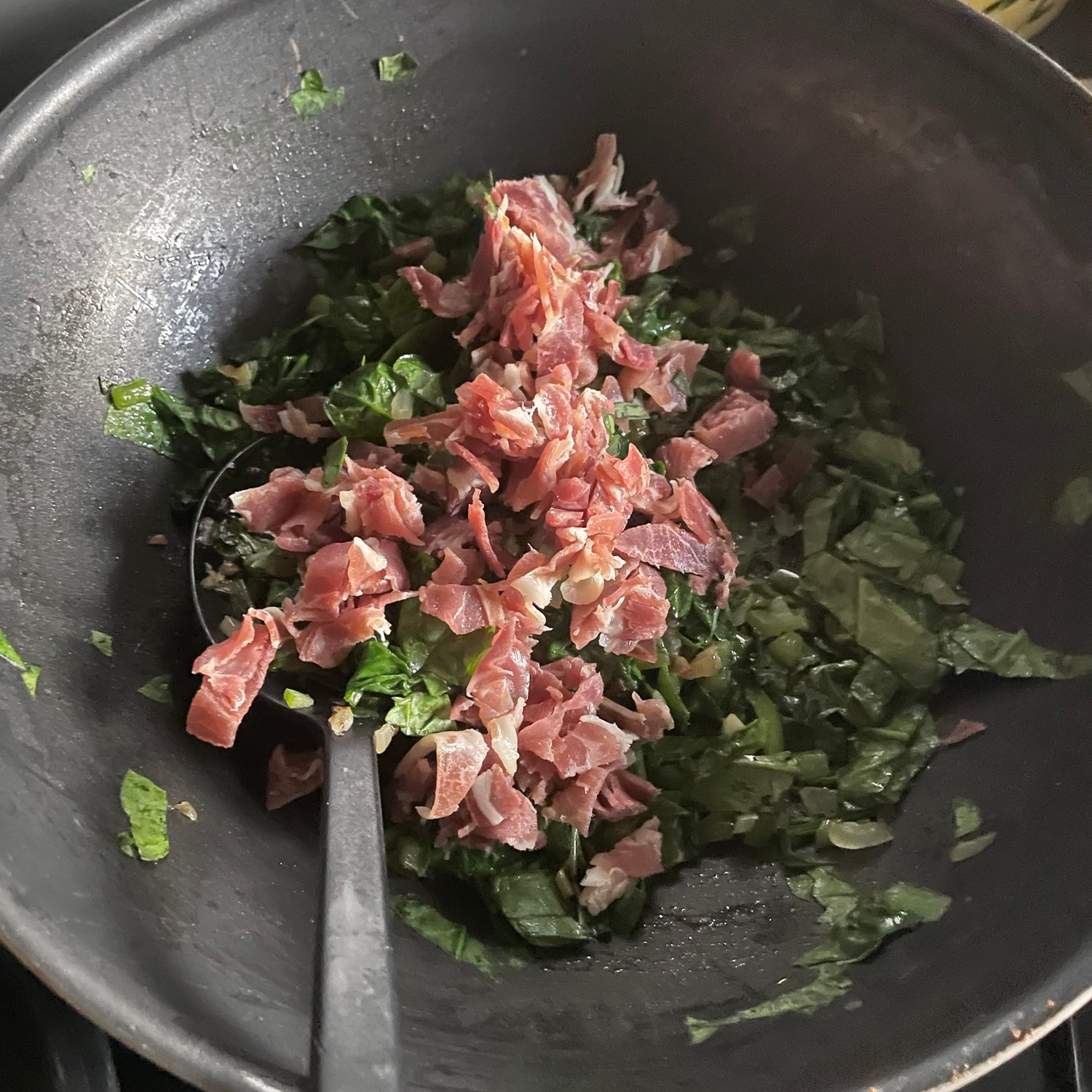 Ajoute ensuite les épinards, puis la coppa. Mélange bien.