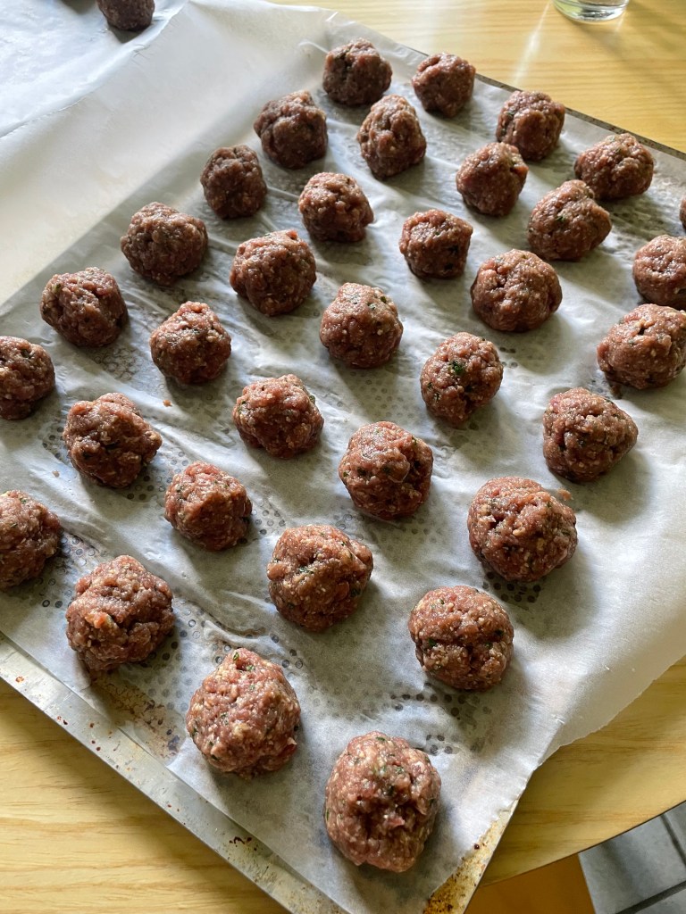 Formez dans vos mains des boulettes qui tiennent dans le creux de votre main. Disposez-les sur une plaque couverte de papier sulfurisé, puis arrosez-les d’un trait d’huile d’olive.