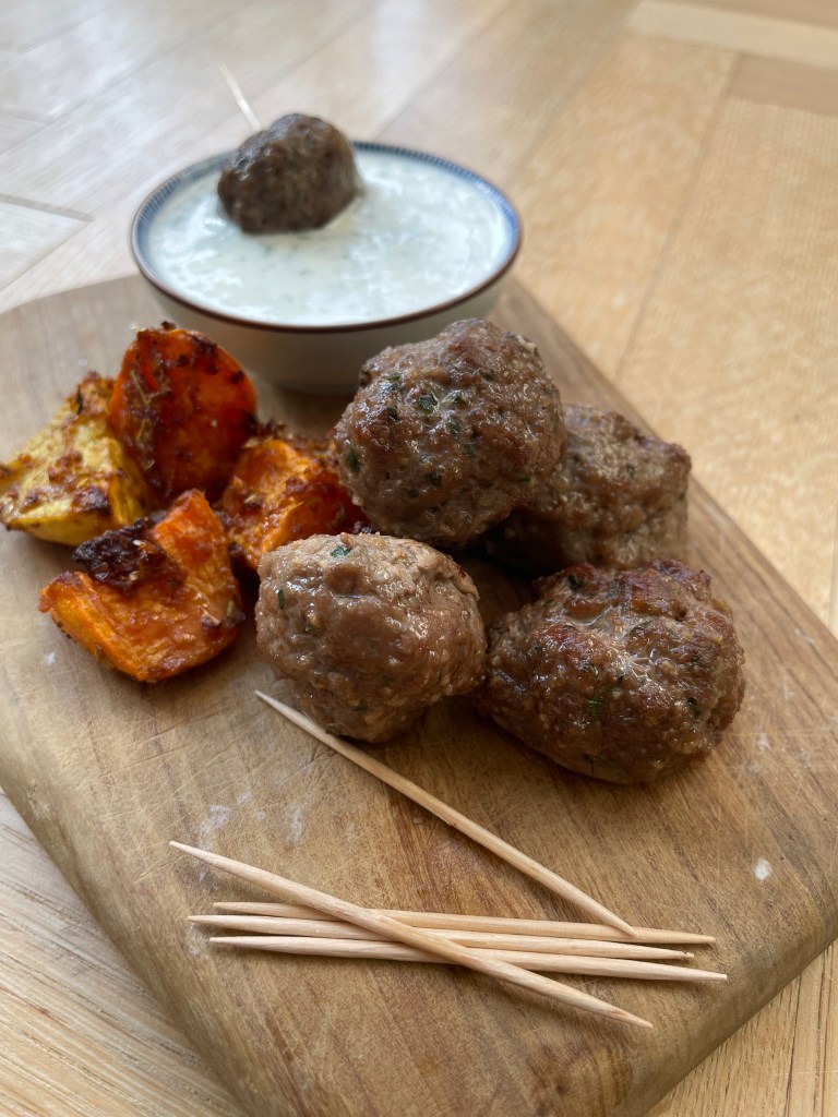 Comment réaliser un apéritif original et savoureux ? Je me suis inspirée de la cuisine orientale pour proposer des keftas et les associer aux patates douces. D’un côté, nous avons la fraîcheur et la touche acidulée des plantes aromatiques : menthe et coriandre. De l’autre côté, la touche épicée et chaude du paprika et de l’ail. L’association fonctionne à merveille.