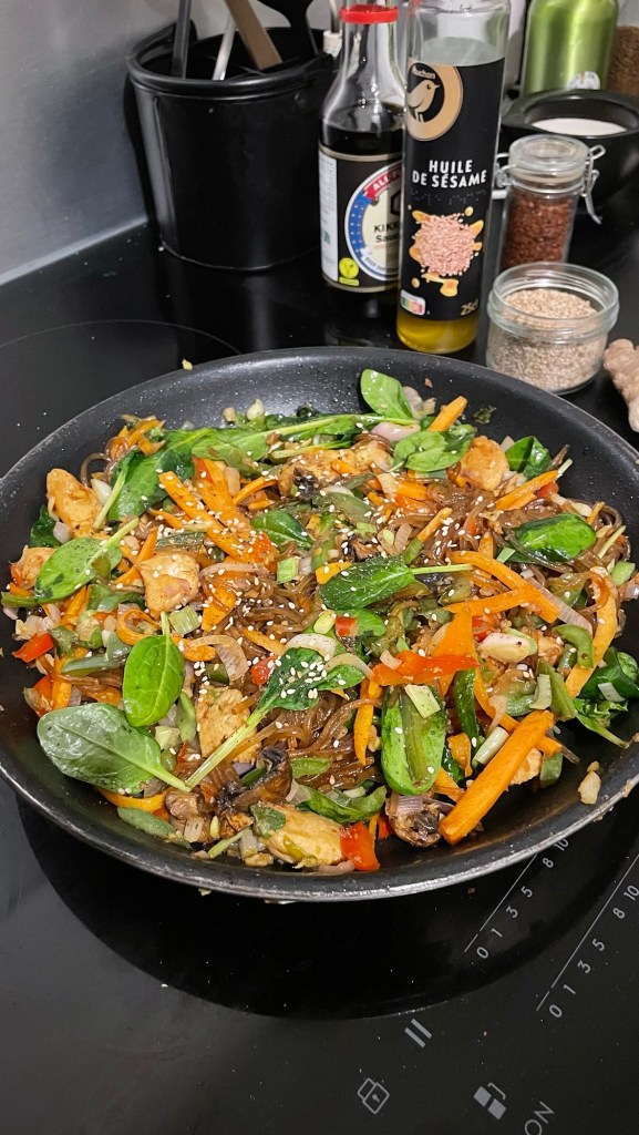 La recette originale de japchae se prépare avec des nouilles de patate douce et non des nouilles de riz. Elles sont très digestes et faciles à préparer. Vous en trouverez dans les épiceries asiatiques et de plus en plus souvent en supermarché.