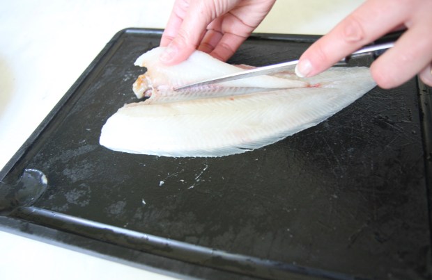 Lever un filet de sole (cut a fillet from a sole) : après avoir paré la sole, à l’aide d’un couteau « filet de sole » à longue lame, inciser l’arête centrale du poisson. Avancer avec la lame sous le filet, délicatement vers l’extérieur, jusqu’à atteindre les barbillons. Répéter la même opération pour les 3 filets suivants.